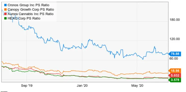 È importante che gli investitori inizino a esaminare attentamente i titoli nei loro portafogli e le loro valutazioni relative. Le azioni di cannabis , in particolare, sono tra le più costose dei mercati data la loro generale mancanza di redditività e bassi numeri di vendita. Un buon esempio qui è Cronos Group ( NASDAQ: CRON ) , che negozia con una valutazione significativamente più alta rispetto alle vendite rispetto a molti dei suoi colleghi: