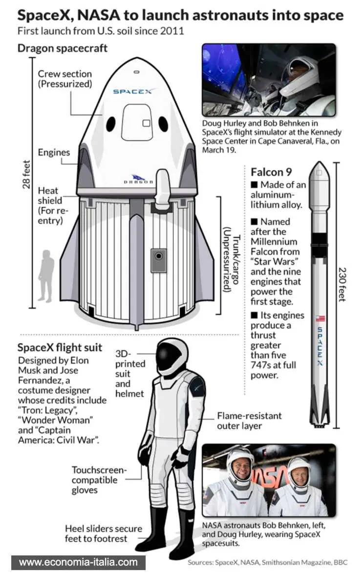 Con il decollo puntuale, la compagnia spaziale privata SpaceX, fondata da Musk, il visionario delle auto elettriche Tesla, ed ex promotore di PayPal divenne la prima compagnia privata a lanciare persone in orbita, un’impresa raggiunta in precedenza da soli tre governi: Stati Uniti, Russia e Cina.